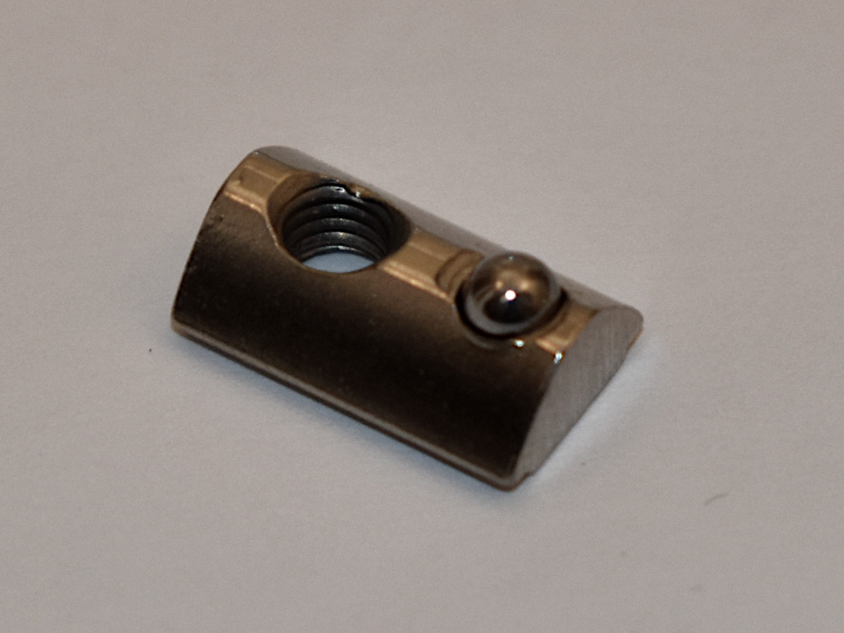 Denne mutteren kan rulles inn i sporet og kan derfor installeres hvor som helst på profilen, uten tilgang til endene. Den fjær-belasteded kulen holder mutteren på plass, noe som er spesielt praktisk for vertikalt monterte profiler.